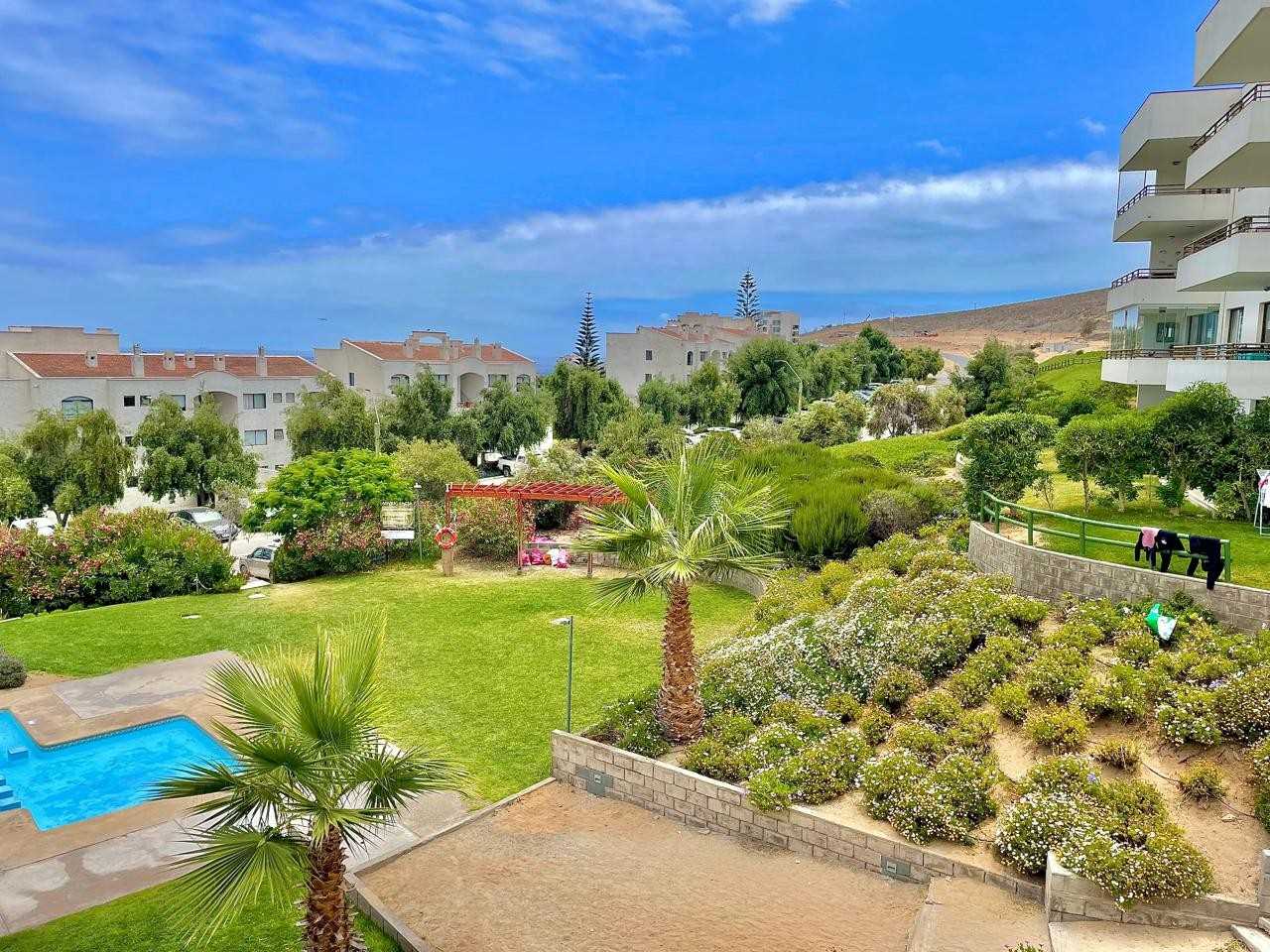 Cómodo departamento hermosa vista con salida a jardín, cercano a piscina y pozas de mar, 1 estacionamiento. Cama matrimonial de 2 plazas y 2 literas de 1 plaza. Calefacción central. No se permiten mascotas.