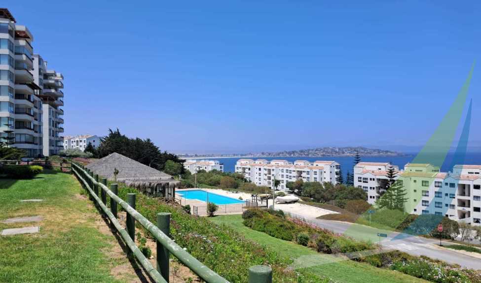 Cómodo y amplio departamento, ubicado en edificio 2, Piso 2. Segunda Línea, hermosa vista al mar, con piscina, cercano a Centro Comercial y funicular. Terraza cerrada vista libre, calefacción eléctrica. 1 Estacionamiento